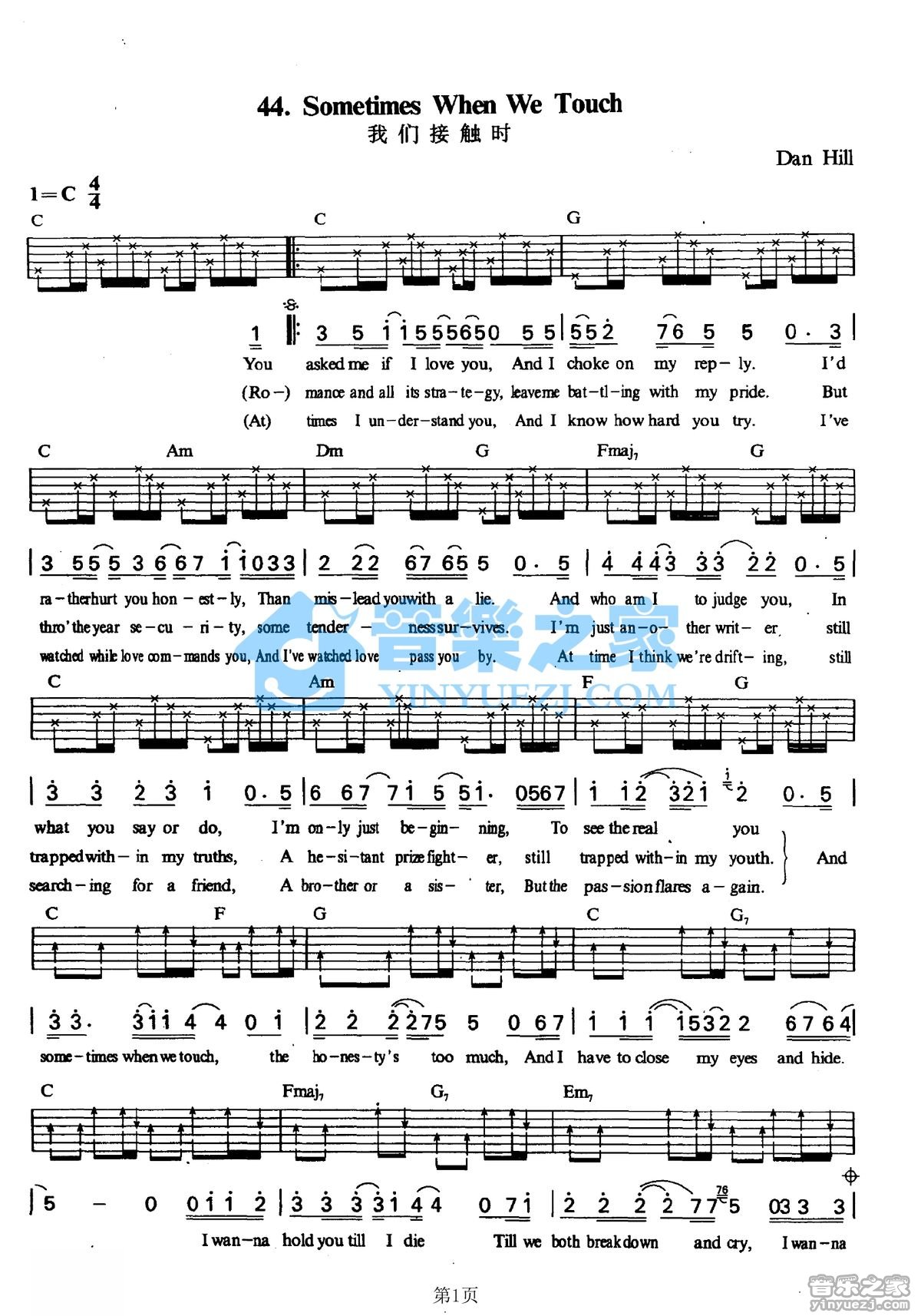C调版《SometimesWhenWeTouch》吉他弹唱六线谱...