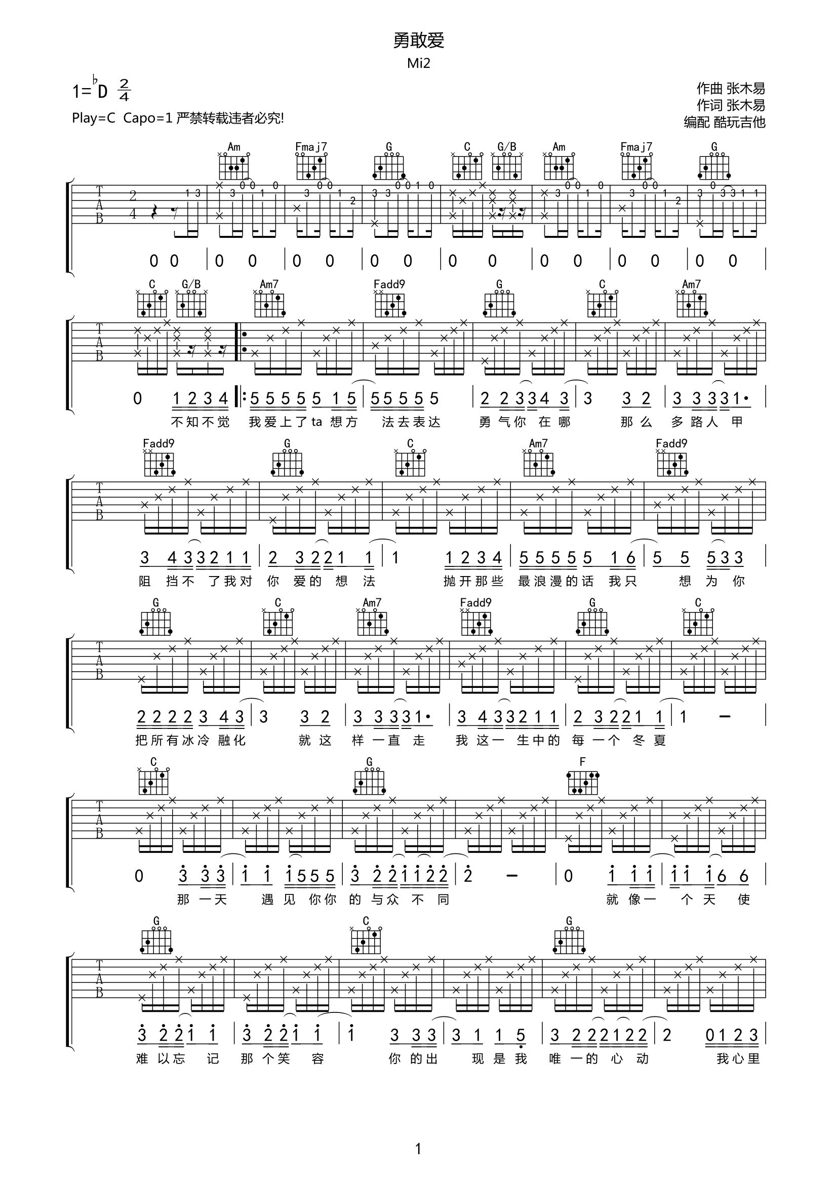 吉他Mi2《勇敢爱》吉他谱-C调弹唱谱高清原版